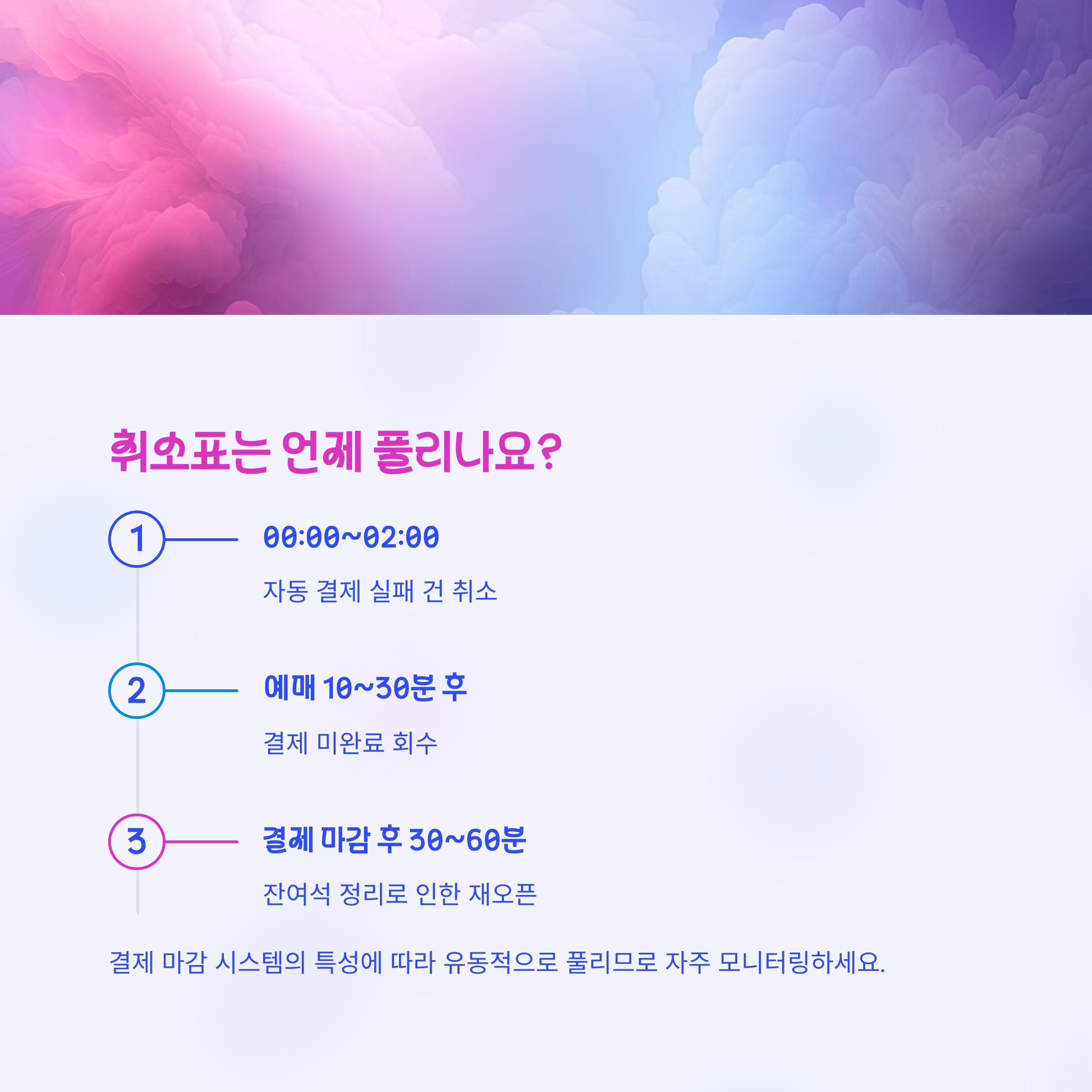 | 결제 마감 후 30~60분 | 잔여석 정리로 인한 재오픈 |