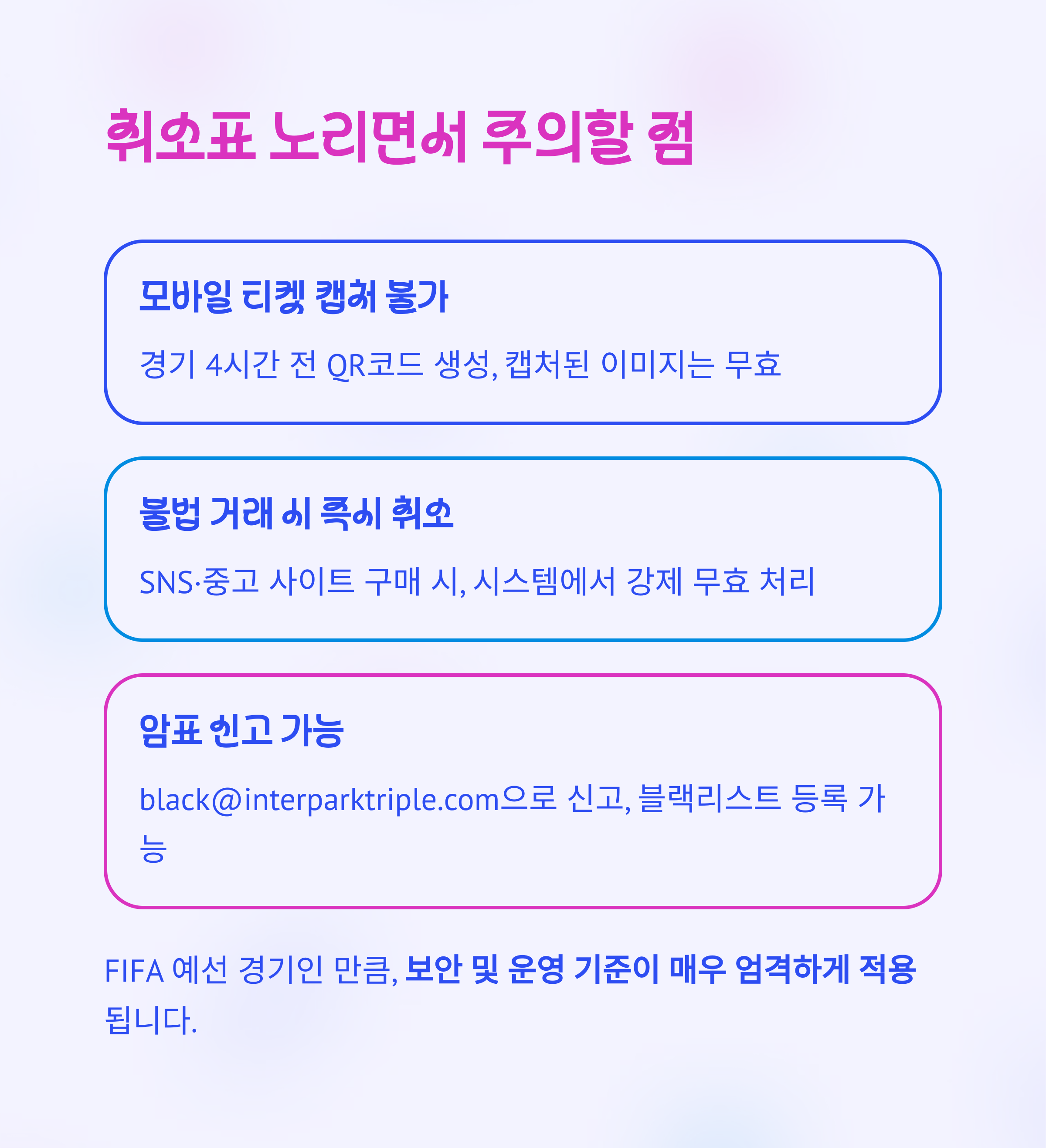 - 모바일 티켓은 캡처 불가: 경기 4시간 전 QR코드 생성되며, 캡처된 이미지는 무효입니다