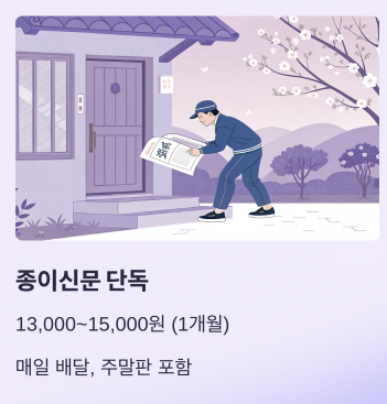 | 종이신문 단독 | 13,000~15,000원 | 종이신문 매일 배달 |