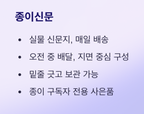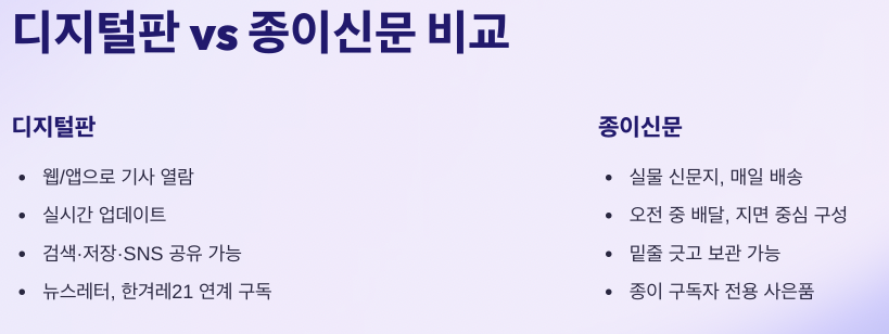 | 형태 | 웹/앱으로 기사 열람 | 실물 신문지, 매일 배송 |